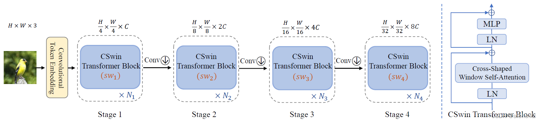 Left: the overall hierarchical architecture of our proposed CSWin Transformer, Right: the illustration of our proposed CSWin Transformer block.