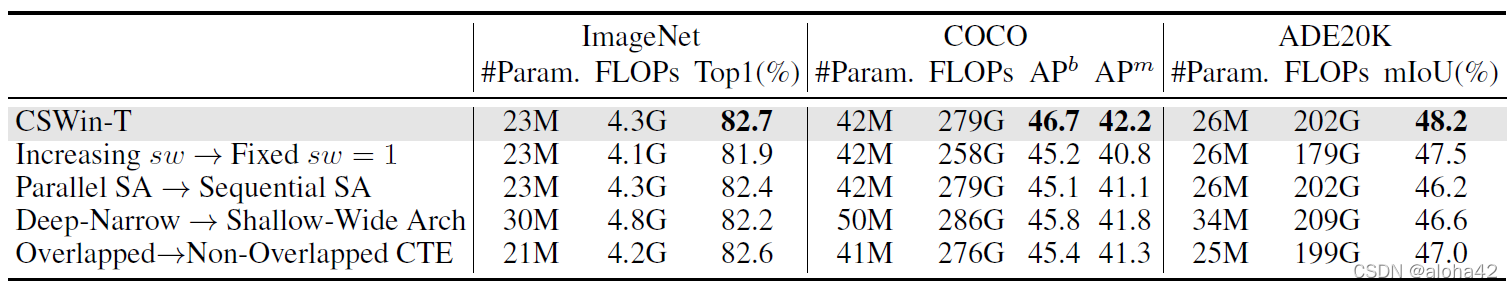 Ablation study of each component to better understand CSWin Transformer. “SA”, “Arch”,“CTE” denote “Self-Attention”, “Architecture”, and “Convolutional Token Embedding” respectively.
