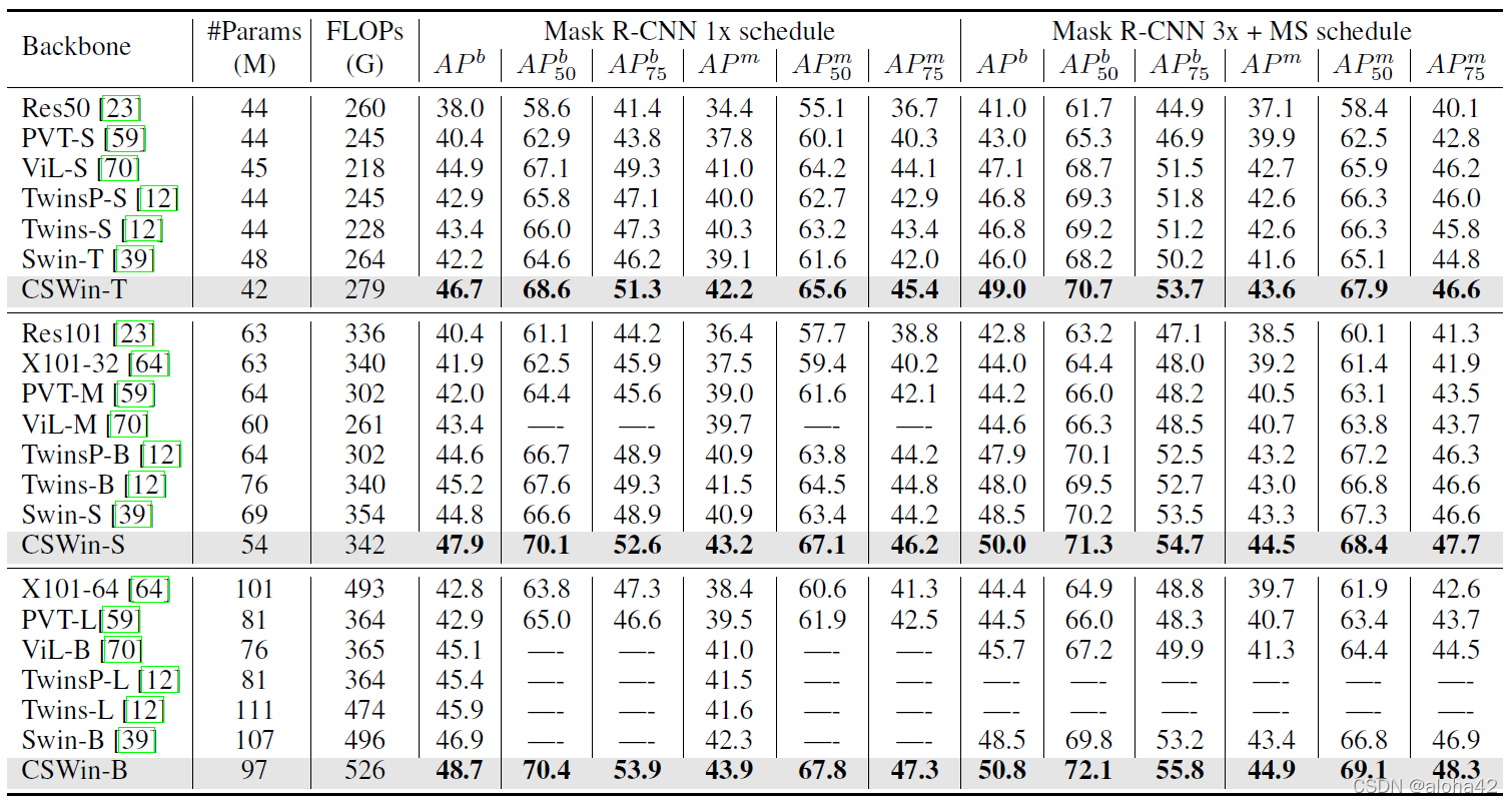 Object detection and instance segmentation performance on the COCO val2017 with the Mask R-CNN framework. The FLOPs (G) are measured at resolution 800x1280, and the models are pre-trained on the ImageNet-1K dataset.