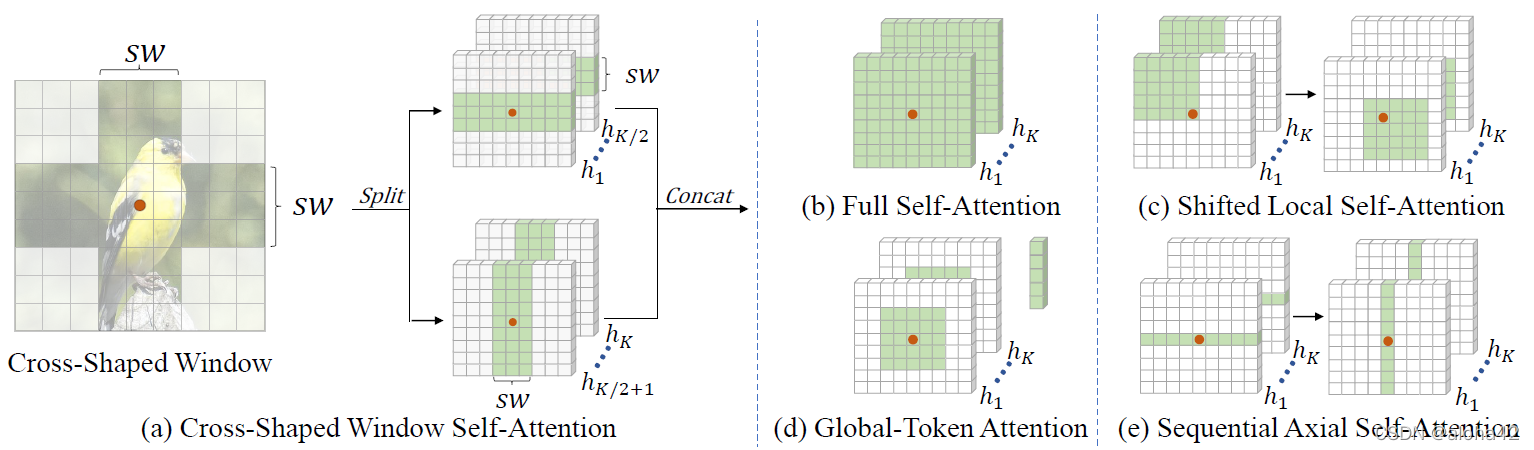 h1?,...,hK?}) is first split into two groups, then two groups of heads perform self-attention in horizontal and vertical stripes respectively, and finally are concatenated together. (b), ?, (d), and (e) are existing self-attention mechanisms.
