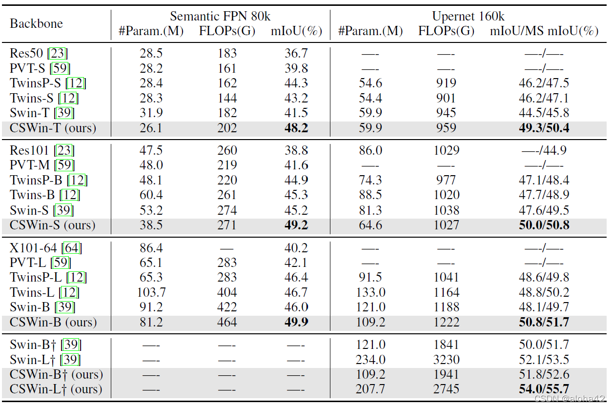Performance comparison of different backbones on the ADE20K segmentation task. Two different frameworks semantic FPN and Upernet are used. FLOPs are calculated with resolution 512x2048. “+” means the model is pretrained on ImageNet-21K and finetuned with 640x640 resolution.