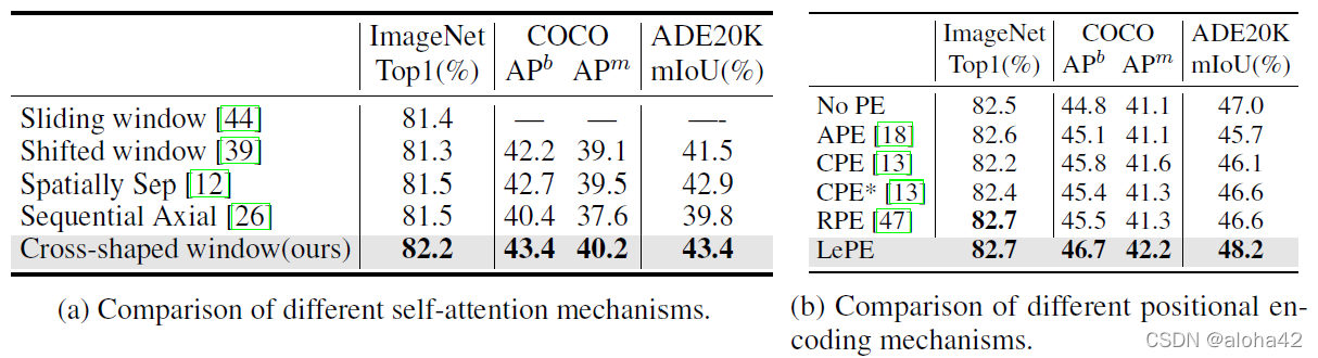 Ablation study of different self-attention mechanisms and positional encoding mechanisms. “*” denotes applying CPE before every Transformer block.