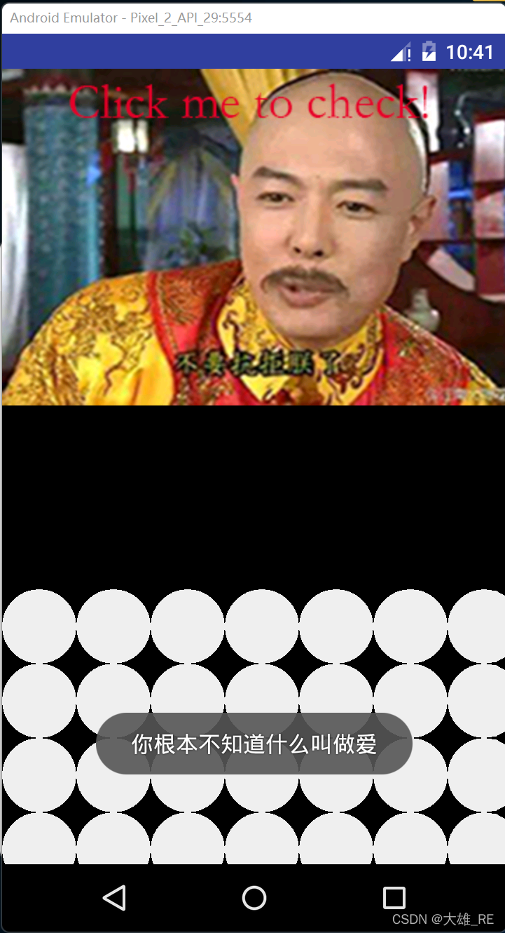 但这是app的原layout,也就是第一个骚年画面的行为,我们知道,在app运行一段时间后,界面会从骚年图像变成“皇上”图像,这对应了MainActivity.onCreate里的这条语句: