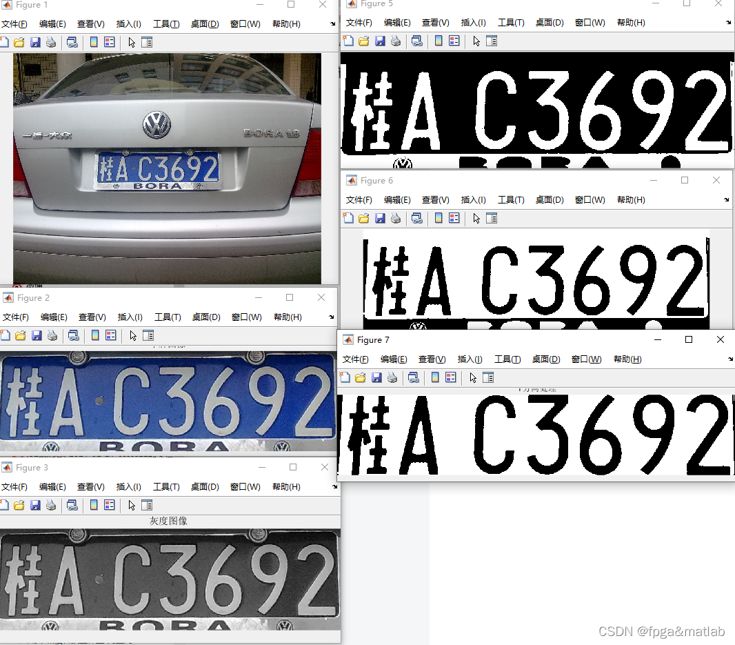%===============车牌区域根据面积二次修正====================== [PY2,PY1,PX2,PX1,threshold]=SEC_xiuzheng(PY2,PY1,PX2,PX1); %==============更新图片============================= Plate=I_bai(PY1:PY2,PX1:PX2,:);%使用caitu_tiqu %==============考虑用腐蚀解决蓝色车问题============= bw=Plate;figure,imshow(bw);title('车牌图像');%hsv彩图提取图像 %==============这里要根据图像的倾斜度进行选择这里选择的图片20090425686.jpg bw=rgb2gray(bw);figure,imshow(bw);title('灰度图像'); %================倾斜校正====================== qingxiejiao=rando_bianhuan(bw) bw=imrotate(bw,qingxiejiao,'bilinear','crop');figure,imshow(bw);title('倾斜校正');%取值为负值向右旋转 %============================================== bw=im2bw(bw,graythresh(bw));%figure,imshow(bw); bw=bwmorph(bw,'hbreak',inf);%figure,imshow(bw); bw=bwmorph(bw,'spur',inf);%figure,imshow(bw);title('擦除之前'); bw=bwmorph(bw,'open',5);%figure,imshow(bw);title('闭合运算'); bw = bwareaopen(bw, threshold);figure,imshow(bw);title('擦除'); %==================加入进度条================================ % h=waitbar(0,'程序运行中,请稍等......') % for i=1:10000 % ? ? waitbar(i/5000,h)? % end % close(h); %wavplay(wavread('程序运行中.wav'),22000); %========================================================== bw=~bw;figure,imshow(bw);title('擦除反色');? %=============对图像进一步裁剪,保证边框贴近字体=========== bw=touying(bw);figure;imshow(bw);title('Y方向处理'); bw=~bw; bw = bwareaopen(bw, threshold); bw=~bw;%figure,imshow(bw);title('二次擦除'); % [y,x]=size(bw);%对长宽重新赋值 % %=================文字分割================================= % fenge=shuzifenge(bw,qingxiejiao) % [m,k]=size(fenge); % %=================显示分割图像结果=========================? % figure; % for s=1:2:k-1 % ? ? subplot(1,k/2,(s+1)/2);imshow(bw( 1:y,fenge(s):fenge(s+1))); % end