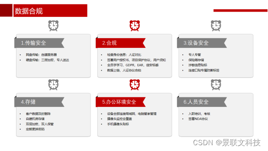 在数据传输安全方面,景联文采用两种传输方式,即自建服务器网盘传输和三层加密专人送达的硬盘传输。自建机房存储,双层加密,双人保管,定期更换密码。存储客户数据及时删除,严格遵循交付即焚。