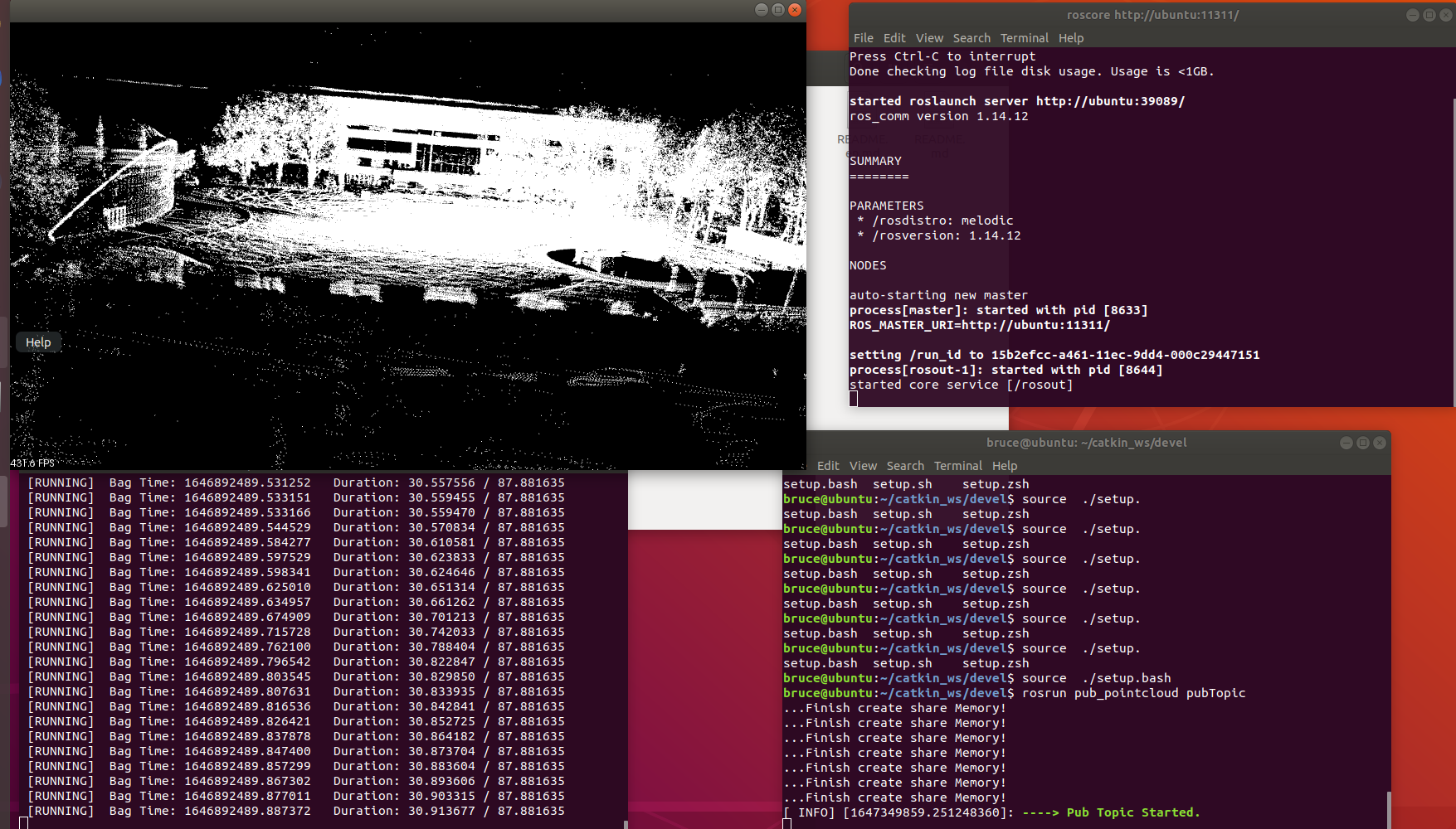 今天在昨天的基础之上,添加了pcl的相关渲染,进行了数据的测试,发现可以成功渲染出数据的图象,这意味着数据的转换是没有问题的。不过这也给我接下来的工作引出了其他问题,我这里的点云是转成了XYZ类型,而实际数据提供的是XYZIR类型,而在RVIZ中根据这些信息还可以渲染出颜色,经过研究,我发现只有I可能与颜色有关,我需要研究如何根据反射强度(I),去转换出每个点的颜色。其次,如何高效存储实时的点云数据也是一个问题,这关乎到点云的渲染以及最后整个模型图的绘制。最后还要加上IMU的数据来实现镜头的移动,还有路径信息将路径渲染出来,不过这些都是后面才考虑的工作。  值得高兴的是这证明了前面的一系列工作都没问题,接下来就是根据现在的情况构思一下新的设计了。