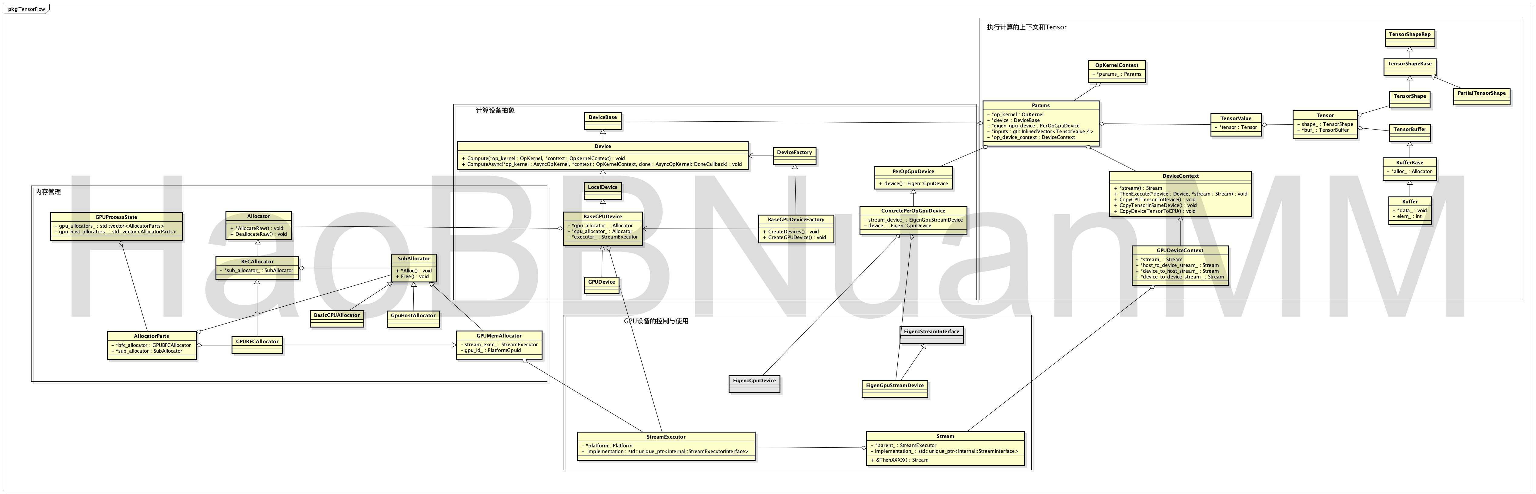 TF Core 核心数据结构 GPU设备的控制与使用模块:把GPU设备抽象为StreamExecutor和Stream API(关于这部分内容的详细介绍,可以参考我的上一篇文章链接)和第三方的Eigen API,用于创建/销毁GPU流、启动GPU kernel、分配GPU内存、调动GPU加速库的等等,真正实现对GPU算力的使用与控制计算设备抽象模块:Google工程师写代码喜欢封装再封装,所以考虑到计算设备的种类很多,所以再框架中封装一层设备抽象模块,用工厂模块创建实例内存管理模块:将分配和管理计算设备内存的操作做了抽象与封装,用工厂模块创建实例执行计算的上下文和Tensor:执行Tensorflow的OpKernel依赖上下文,包括Kernel的上下文和Device设备的上下文,这个上下文中包含了诸如设备对象、Kernel对象、Input Tensor、设备流 等实例,在执行OpKernel计算的时候提供对GPU设备的抽象控制