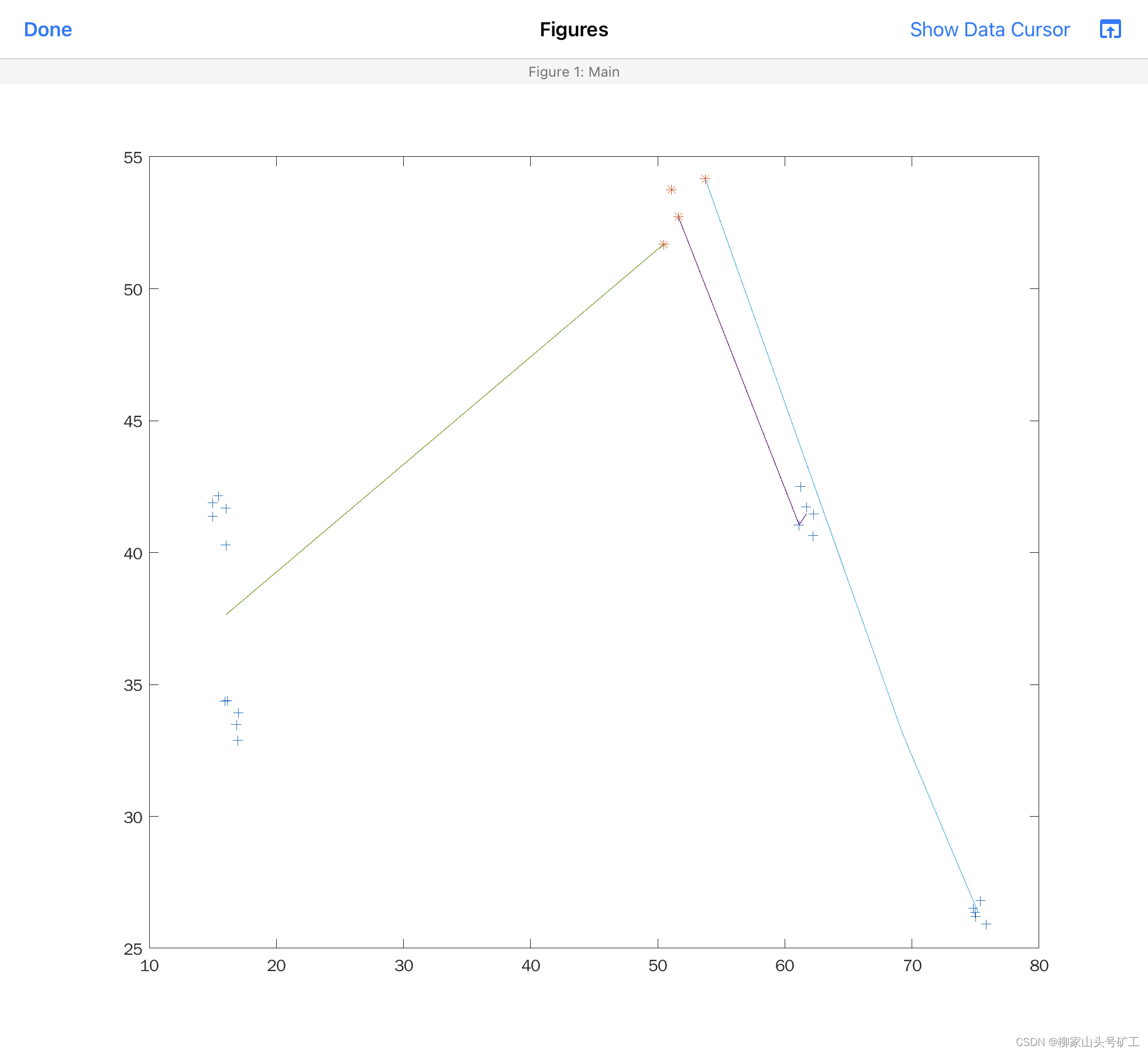 ‘+’表示数据集分布 ‘*’表示聚点起点 直线表示聚点迭代轨迹