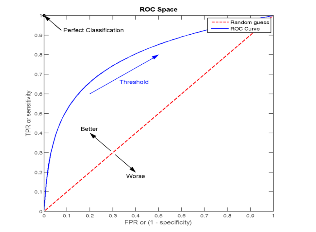 - AUC = 1,是完美分类器,采用这个预测模型时,存在至少一个阈值能得出完美预测。但绝大多数预测的场合,不存在完美分类器。