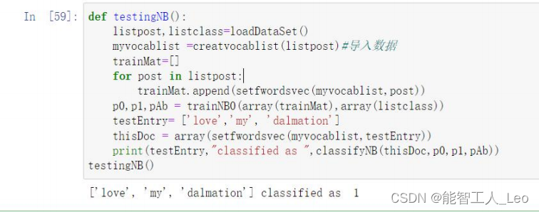 - 测试函数,输入一个新的样本[‘love’,‘my’, ‘dalmation’],应用之前 的训练集和分类器,完成分类任务。