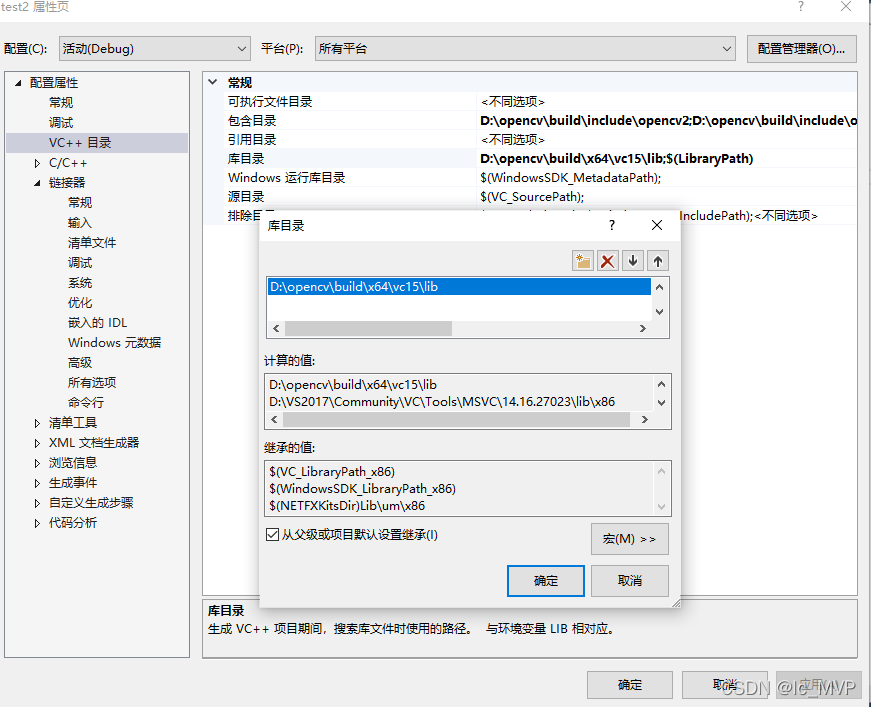 库目录中添加:(此处根据自己电脑中opencv的路径进行添加)