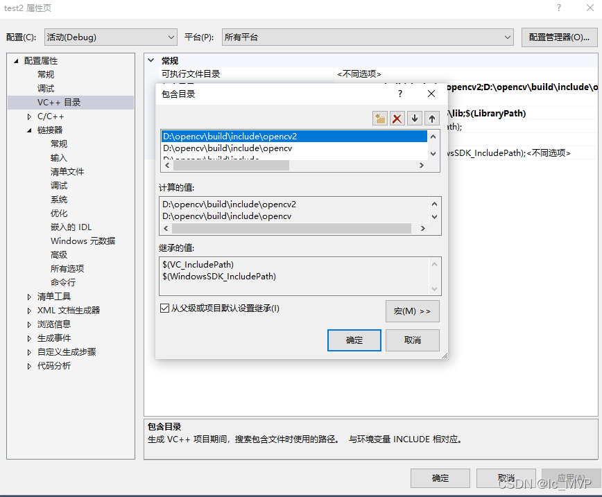 包含目录中添加:(此处根据自己电脑中opencv的路径进行添加)