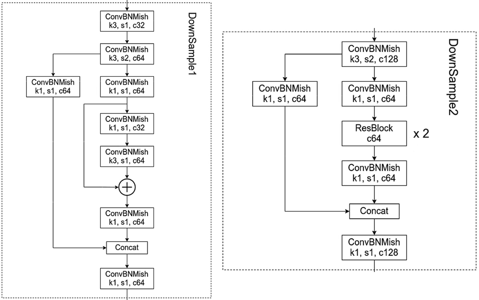 模型的骨干就是由多个CSP结构组合而成,但是第一个CSP结构和其他的CSP结构不相同。以输入图像的shape为 [416,416,3] 为例。有如下两点不同:第一个CSP结构是先经过一个标准卷积块下采样,然后经过3*3卷积提取特征,不改变通道数64;在主干卷积分支的残差块,先1*1卷积下降通道数32,再3*3卷积上升通道数64。