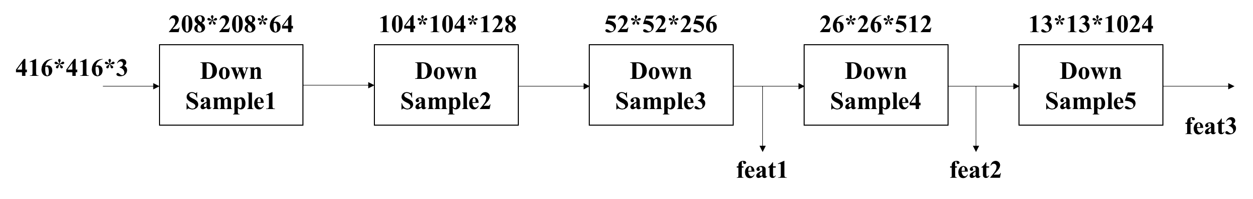 输入图像的shape为[416.416,3],网络不断进行下采样来获得更高的语义信息,输出三个有效特征层,feat1的shape为 [52,52,256] 负责预测小目标,feat2的shape为[26,26,512] 负责预测中等目标,feat3的shape为[13,13,1024] 负责预测大目标