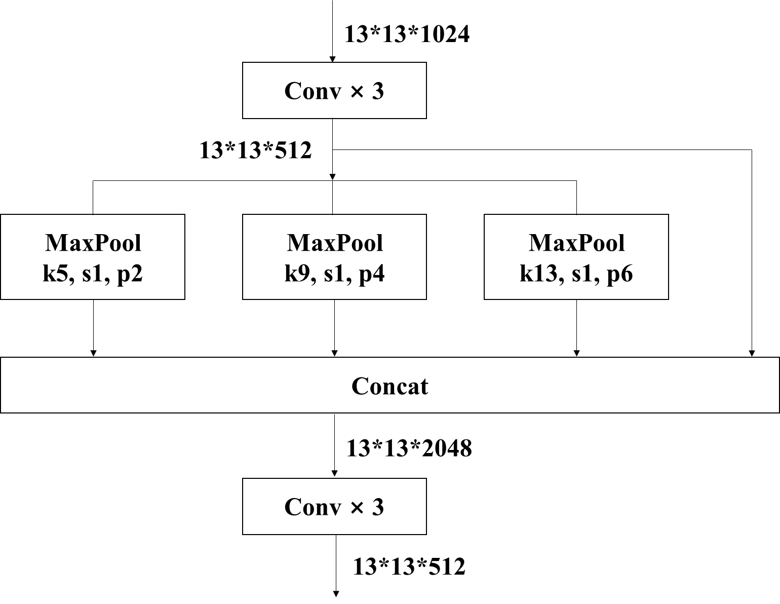 对网络模型输出的 feat3 先经过三个卷积层调整通道数,然后分别使用池化核size为 5*5,9*9,13*13 的最大池化,通过padding='same' 使得池化前后的特征图的shape是完全相同的。然后将原始输入和三种池化的结果特征图在通道维度上堆叠。最后经过三次卷积融合通道信息。