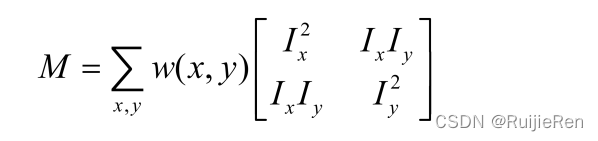 (3)使用高斯函数对Ix2、Iy2、IxIy进行高斯加权(取σ=2,ksize=3),计算中心点为(x,y)(x,y)的窗口W对应的矩阵M;
