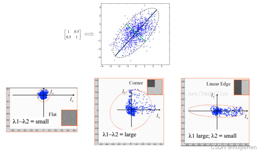 ? ?(1)?图像中的直线:一个特征值大,另一个特征值小,λ1>λ2或λ2>λ1。自相关函数值在某一方向上大,在其他方向上小。