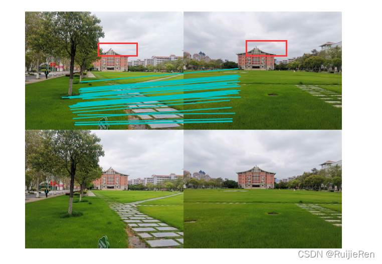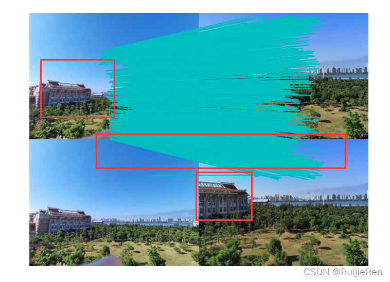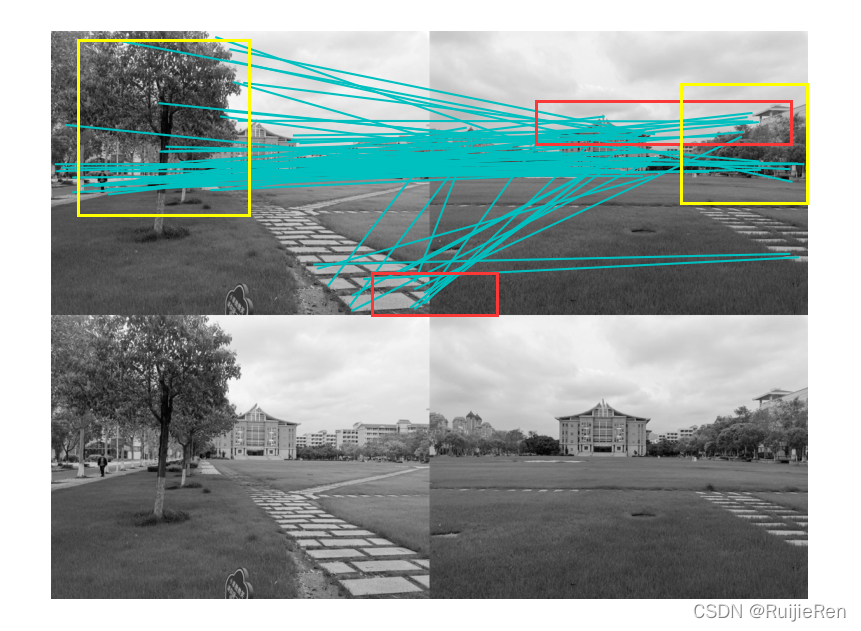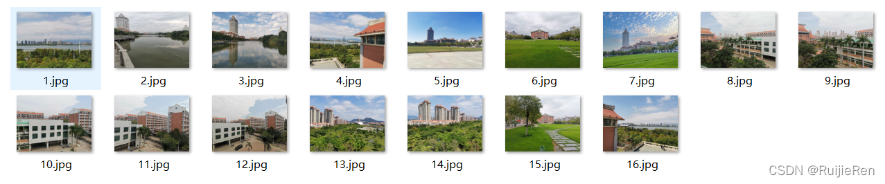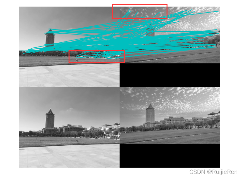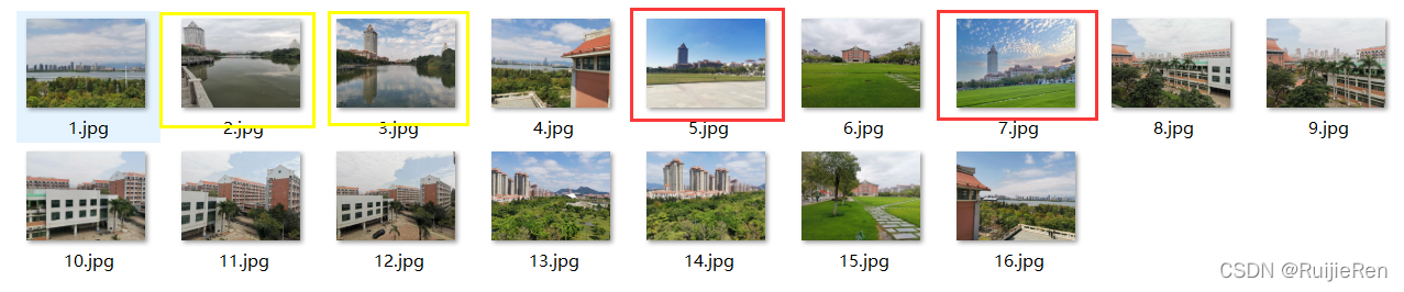 ?结果分析:2.jpg和3.jpg是在不同角度、不同光线下拍的,通过人眼很明显看出两者有关联性,同样5.jpg和7.jpg也有明显特征建筑,但是匹配结果并未显示,猜测原因是由于拍摄角度偏差太大导致,1.jpg,16.jpg,4.jpg是同一大场景拍的三张,可以拼为一张完整的,结果也是得到了很好的匹配。通过测试发现图像拍摄角度对SIFT特征匹配有较大影响,数据集图片的大小对运行效率也有一定的影响,建议将图片尺寸修改为1000以内。