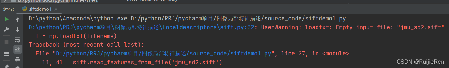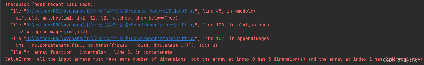 结果分析:两组图像的匹配结果对比,SIFT特征匹配相对更好一点,因为它有较高的运行效率,同时匹配的正确率也不错,但仍然有房屋建筑这种明显点没有得到匹配,同时对某一建筑物拍摄角度的要求会较高,SIFT在图像的不变特征提取方面拥有一定的优势,对角度差别较大的同一图像检测出的特征点过少。而Harris角点检测对对角度的要求较低,但是不存在尺度不变性,运行效率明显低于SIFT。总而言之,两种方法的选择?视情况而定,在用SIFT检测时,注意要用相同大小的图片,否则会报错无法运行,如下: