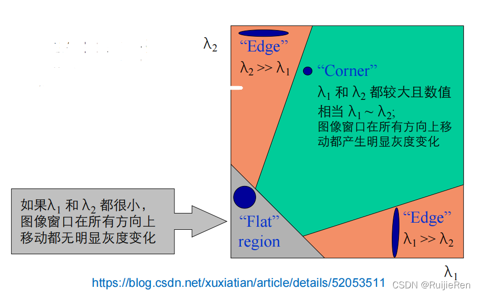 通过M的两个特征值λ1和λ2的大小对图像点进行分类: