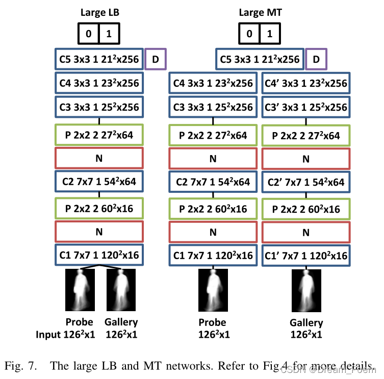 Matching Local Features at the Bottom Layer (LB) 在计算能量图对的差别之前只用了线性层,是由最底层的16个卷积核实现的。对于两个输入,首先对两个输入的局部区域进行重新加权,再对加权后的结果求和。 目的是基于cross-view的步态识别模拟线性归一化,几乎等价于intro中所述的第三类方法,但这里在做了matching之后还有两个卷积层,是为了从能量图对中学习更复杂的模式。  -