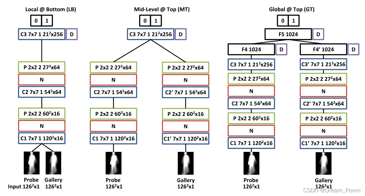 Matching Global Features at the Top Layer (GT) 能量图对通过学习到的全局特征来计算差别。相比于MT多了两个全连接层。F4和F4‘进行了参数共享。因为全连接层的关系,GT网络的复杂度要比前两种高很多,很有可能会因为数据量从而导致过拟合。但优点是网络很紧凑,可以提高计算效率。 对于LB和MT,每次计算都需把一个probe和N个gallery通过整个网络,但这里GT可以提前存储所有gallery在F4’层的输出(为啥这儿能保存呢,我的理解是,神经网络在卷积层学到的模式是局部特征,而全连接层是全局特征,局部特征的学习到的模式可能对于gallery的每一个能量图对都有所不同,所以能够保存的只能是全局特征) -
