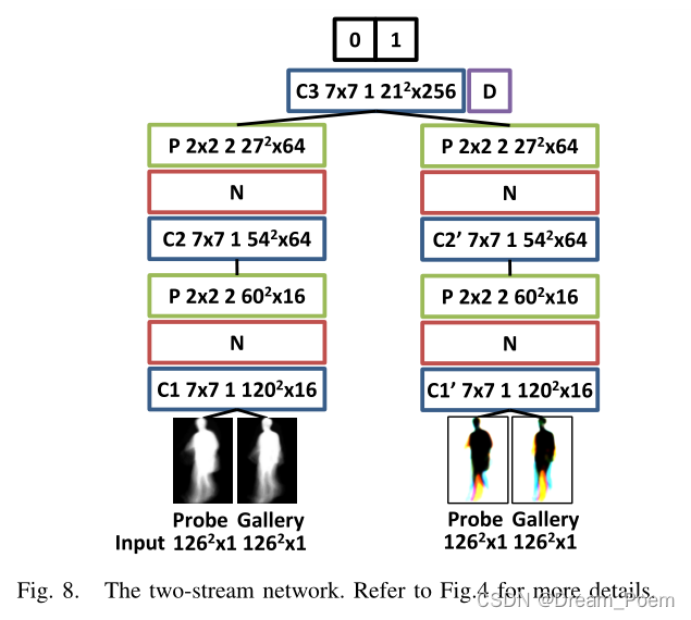 训练了一个叫做”双流网络“的东西:左边是和上文中和LB相同的结构与输入;而右侧输入是时序步态图像(CGI,通过颜色映射的方式携带时序信息),是处理视觉流相应的部分。  -