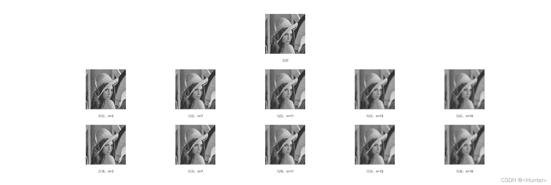 对于2-D均值滤波,通用我们取不同的n,从效果(见图7)可以看出,随着n的增大图片逐渐模糊,细节逐渐丢失,但相较于线性滤波来说,他的细节保留会好一些。