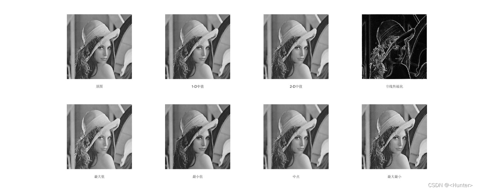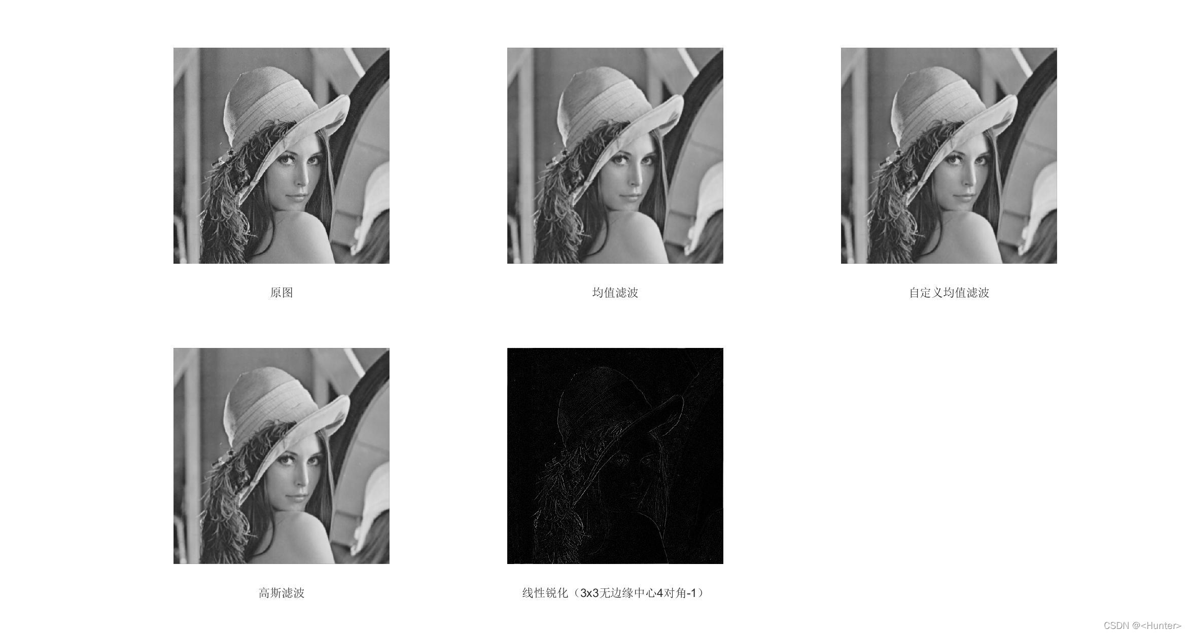 首先这里变化比较明显的是线性锐化,可以看见图中只剩下lena的轮廓,但是也可以发现均值滤滤波和高斯滤波都将图片变得模糊了。