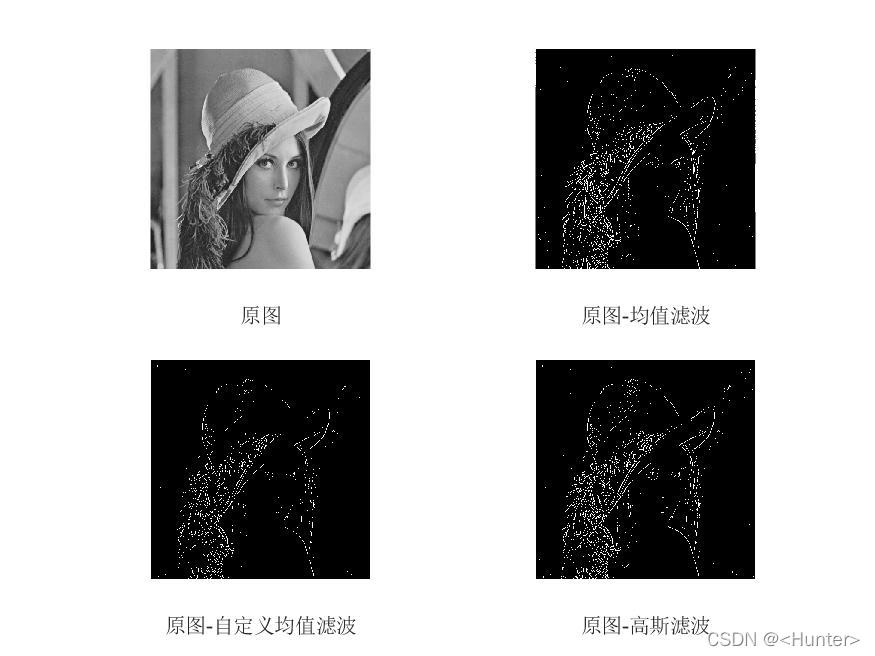 这里做一个减法然后将其进行了阈值为10的阈值分切见图4.2),可以发现原图减去滤波后的图阈值分切后,能看到lena的轮廓,也就是均值、高斯滤波对图像的边缘都有虚化作用。