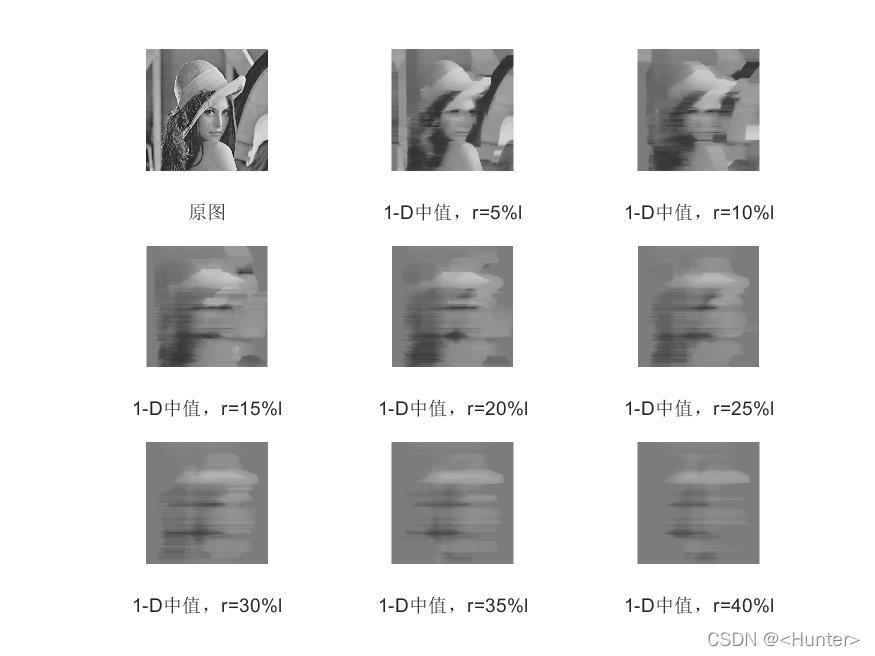 1-D中值,我们看通过调整他的r的大小,效果的变化(见图6),可以看到,随着r的增大图片逐渐呈线状模糊,且其值越接近于0。