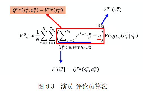 基于上述两种思想,演员-评论员算法的策略梯度为: