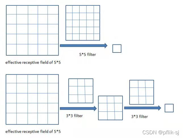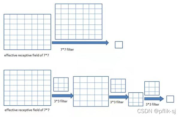 若输入图像的尺寸大小是7*7,经过三次3*3的卷积核(其中stride=1,padding=0)后,其感受野大小为7*7,如下图所示:  (由卷积计算公式:N=(W-F+2P)/S+1,得到第一次卷积后的图像大小为5*5,第二次卷积后的图像大小为3*3,第三次卷积后的图像大小为1*1)