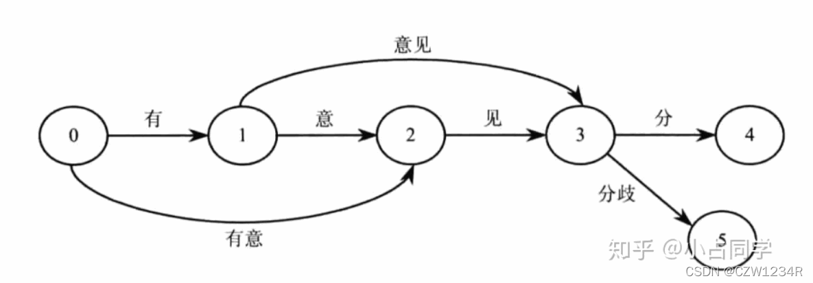 #对于每一种划分,都将相应的位置相连,构造有向无环图 def getDAG(sentence:str): ??? global PrefixDict,Possibility ??? DAG = {} ??? N = len(sentence) ??? for i in range(N): ??????? lst_pos = [] ??????? #这个列表是保存那些可以用第i个字符组成单词的字符的索引。 ??????? j = i ??????? word = sentence[i] ??????? lst_pos.append(i) ??????? while(j<N and word in PrefixDict): ????? ??????if(word in Possibility): ??????????????? if(lst_pos[0]!=j): ??????????????????? lst_pos.append(j) ??????????? j+=1 ??????????? word = sentence[i:j+1] ??????? #把这个第i个列表放入DAG[i] ??????? DAG[i]=lst_pos ??? return? DAG