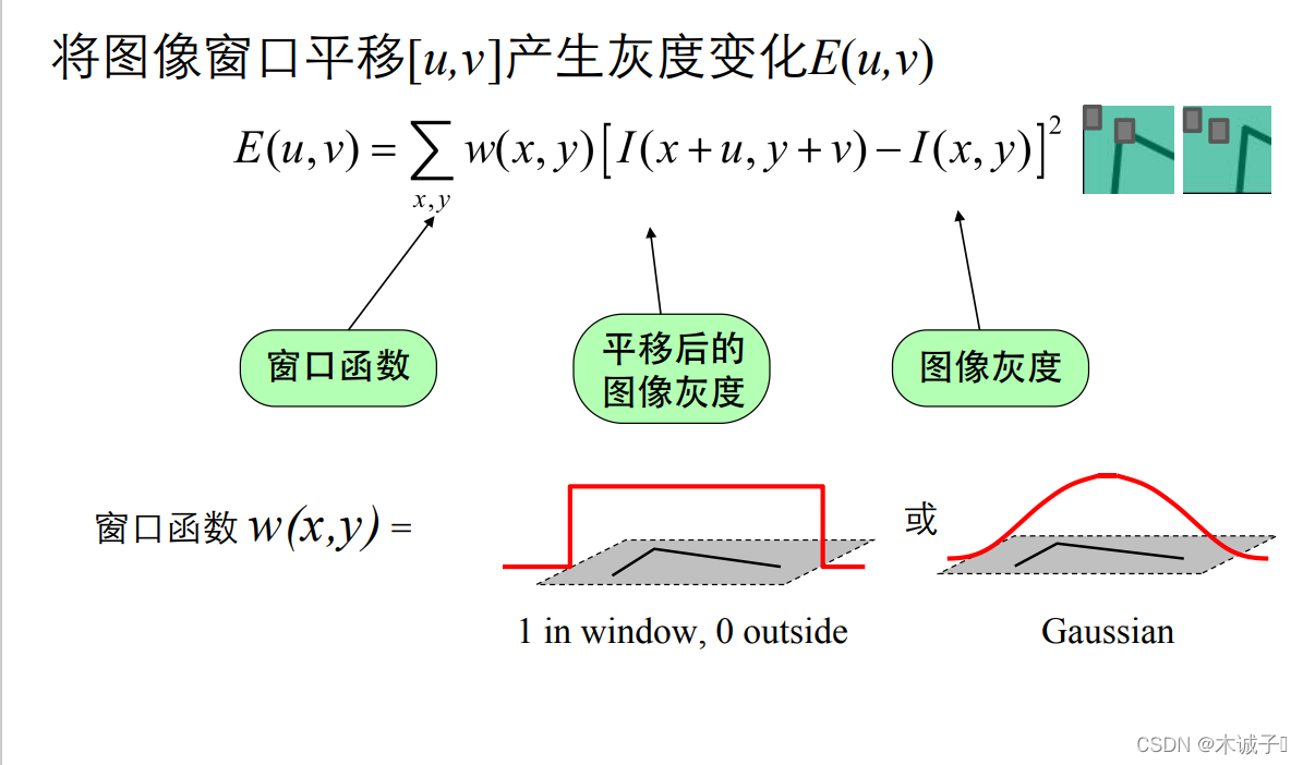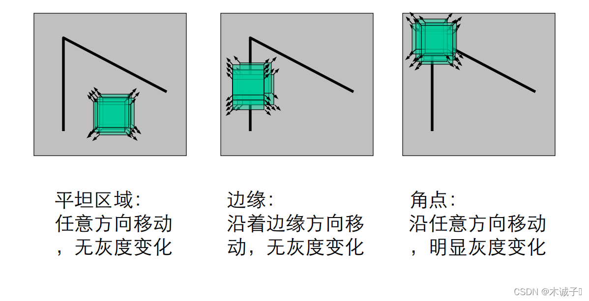 利用矩形窗在图像上移动,若窗内包含有角点,则窗口向各个方向移动时,窗内的灰度值都会发生变化。从而达到检测图像角点的目的。如果像素周围显示存在多于一个方向的边,我们认为该点为兴趣点。该点就称为角点。