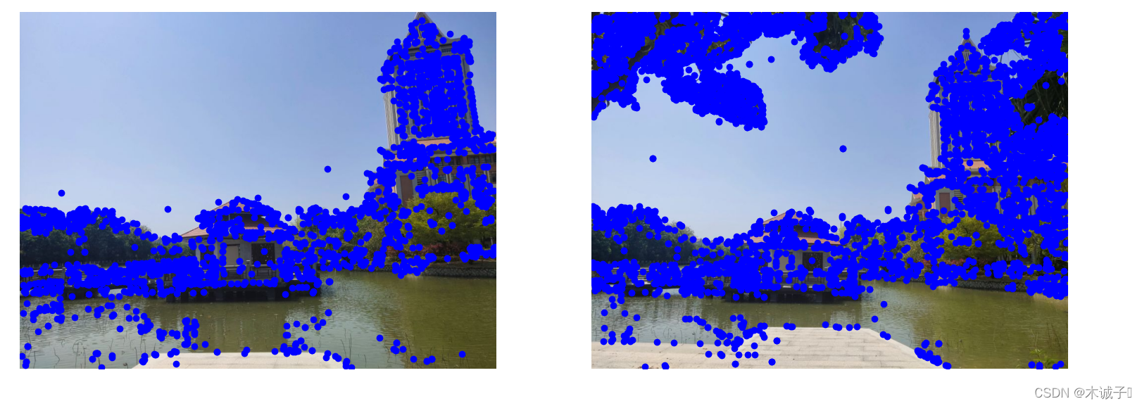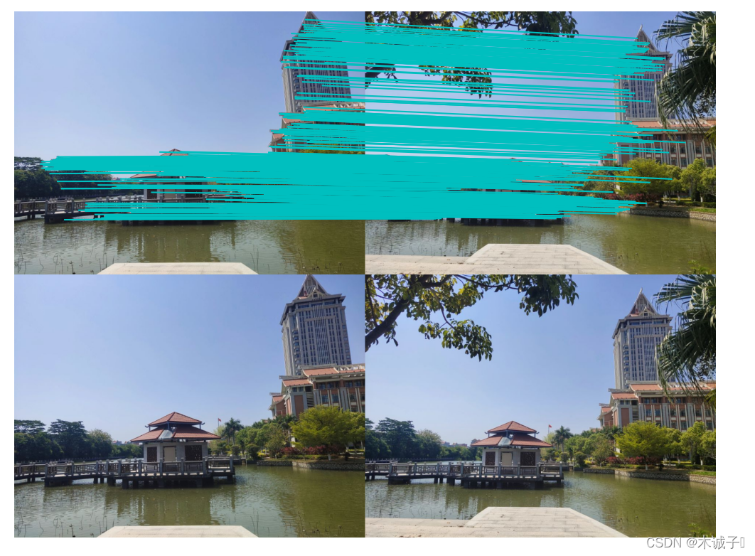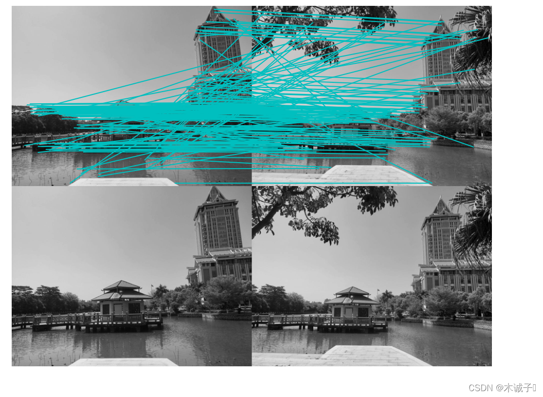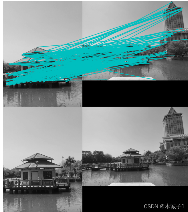 可以看到SIFT算法的匹配效果比?Harris匹配效果好非常多,同一场景,尺度稍微改变了一下,Harris算法肉眼可见出现很多匹配错误点,而SIFT算法肉眼完全看不到匹配错误点,这是因为SIFT算法具有尺度和旋转不变性,即使两张图大小不一样、角度不一致也不会影响匹配结果,而Harris角点对尺度变化非常敏感,当遇到尺度变化较大时,很多正确特征点无法检测出来。