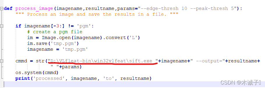 ?然后打开win32vlfeat文件,复制它的位置路径(我的是D:\VLfleat-bin\win32vlfeat),接着找到PCV库里的sift.py文件打开修改下面的process_image方法(sift.exe后面要有一个空格)即可完成配置