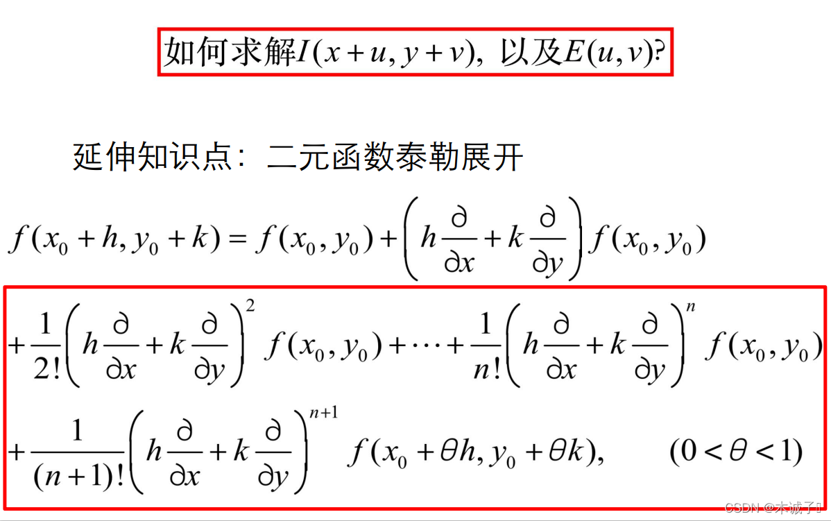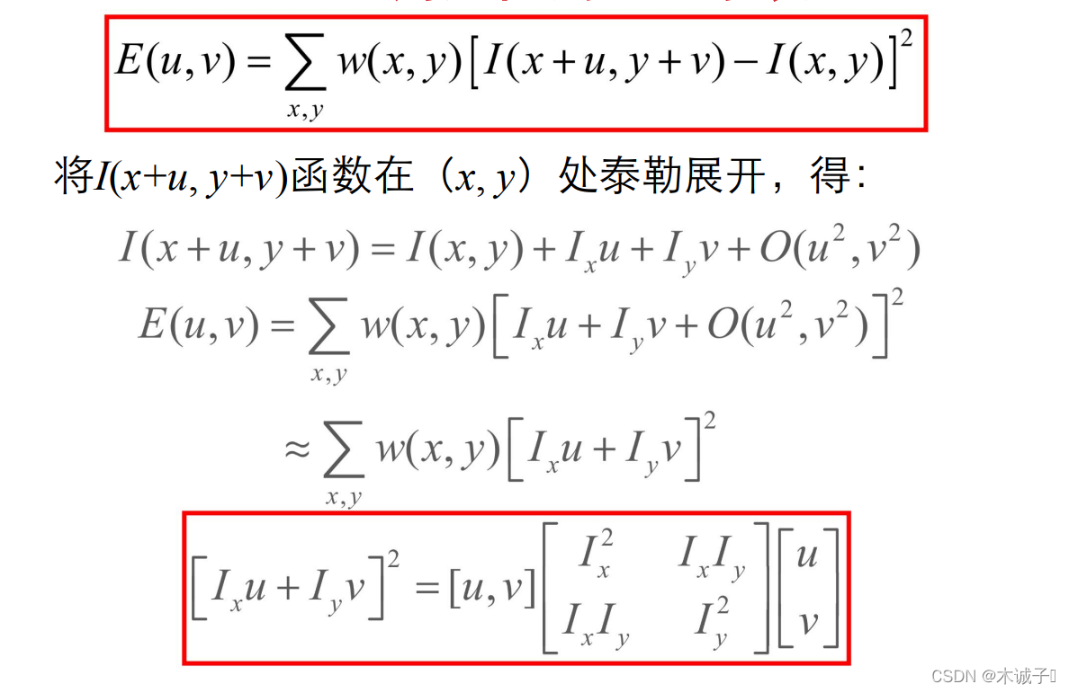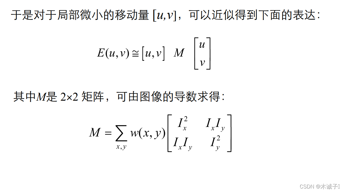 - 当窗口(局部区域)同时向 xx (水平)和 yy(垂直) 两个方向移动时计算窗口内部的像素值变化量 E(x,y)E(x,y) ;