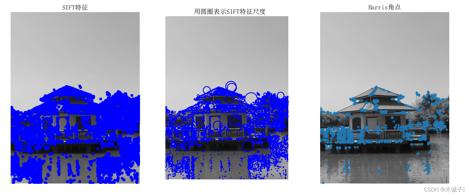 可以看到,与Harris角点检测相比,sift提取出来的特征点信息更多,而且更加精准,这是因为sift的特征点提取步骤比Harris的步骤复杂的多,它需要建立高斯图像金字塔和高斯差分金字塔之后再检测极值,而Harris角点只是对原图进行角点检测和变化。?
