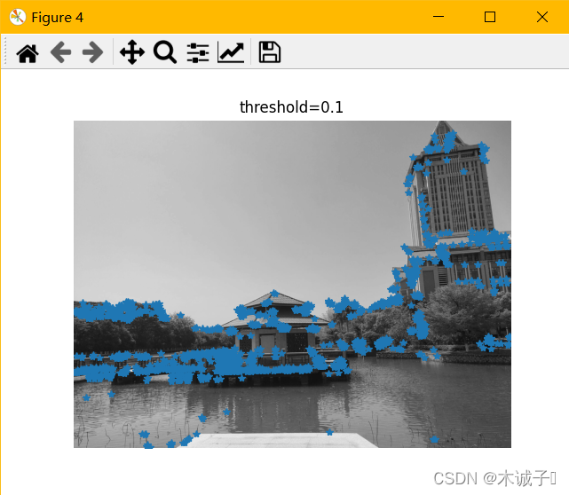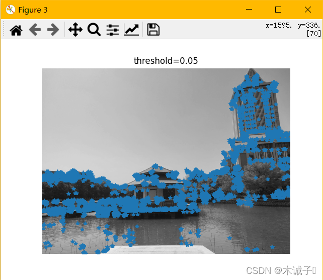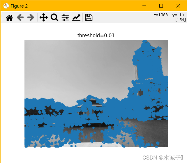 从上图可以明显看出,随着阈值从0.01增到0.05再到0.1,检测出的角点越来越少,并且角点检测算子对亮度的变化更敏感,在亮区域角点更多。可以看出,Harris角点检测获取的角点在图像中分布不均匀(对比度高的区域角点多)。