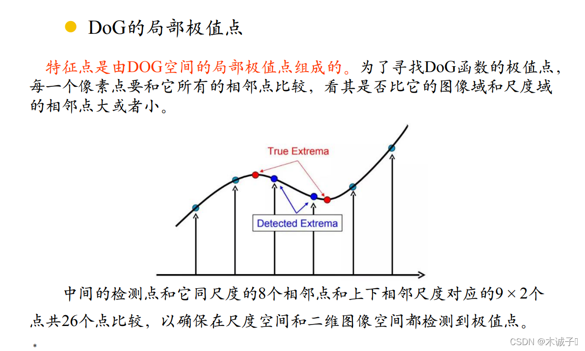 首先构造DoG尺度空间,在SIFT中使用不同参数的高斯模糊来表示不同的尺度空间,而构造尺度空间是为了检测在不同尺度下都存在的特征点,特征点的检测比较常用的方法是高斯拉普拉斯,但是LoG的运算量是比较大的,Marr和Hidreth指出可以使用DoG(高斯差分)来近似计算LoG,所以在DoG的尺度空间下检测极值点。