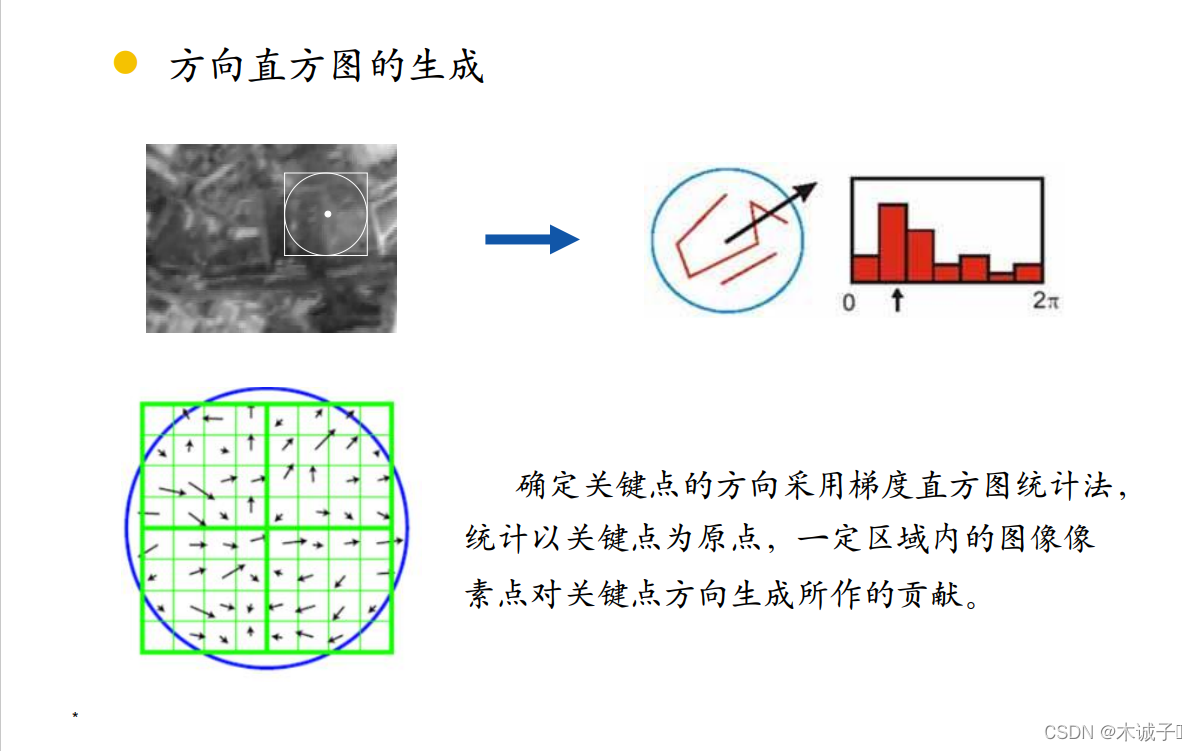 以特征点的为中心、以3×1.5σ3×1.5σ为半径的领域内计算各个像素点的梯度的幅角和幅值,然后使用直方图对梯度的幅角进行统计。直方图的横轴是梯度的方向,纵轴为梯度方向对应梯度幅值的累加值,直方图中最高峰所对应的方向即为特征点的方向。