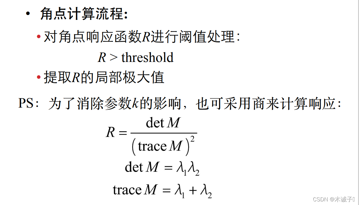- 然后对该函数进行阈值处理,如果 R>threshold,表示该窗口对应一个角点特征。