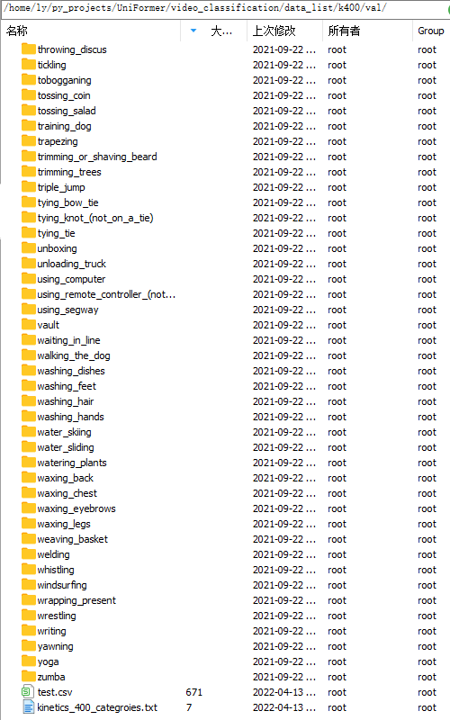 - 下载好数据就需要准备数据了【数据裁剪我们就不做了哈】,根据官网提供的,我们可以知道k400目录下有几个文件,train的就不管了,val就相当于test,那么我们只保存和test有关的就行了。也就是这样就行了【我还没有把数据集传到这个目录下,因为需要处理一下】:
