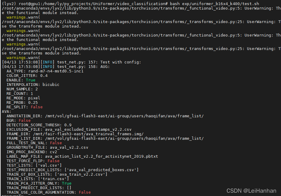 - test.yaml中,由于只使用test,那么把TRAIN: False(即不训练),使用uniformer_base_k400_16x4,如果是单GPU那么NUM_GPUS要设置成1,不然会报no more GPU devices的错,还有官网提供的测试时需要修改的参数。