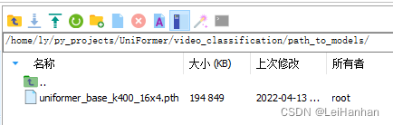 - 下载模型:uniformer_base_k400_16x4.pth,然后我把它放到了新建的path_to_models文件夹里面【因为在UniFormer.py这个文件里面它定义了这个路径,在这儿改了就不用改UniFormer.py里面的内容了】