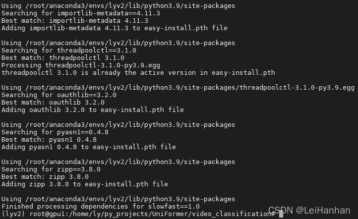 - 上面的依赖库安装好后就下载UniFormer(命令可以一条一条执行)【注意:git clone就是下载网址的文件也就是UniFormer这个源码,所以你先进入一个目录再执行这条命令,这样你就把UniFormer下载到这个目录里面了。cd 就是进入你下载的UniFormer下的video_classification目录。python就是执行这个setup.py文件部署UniFormer】