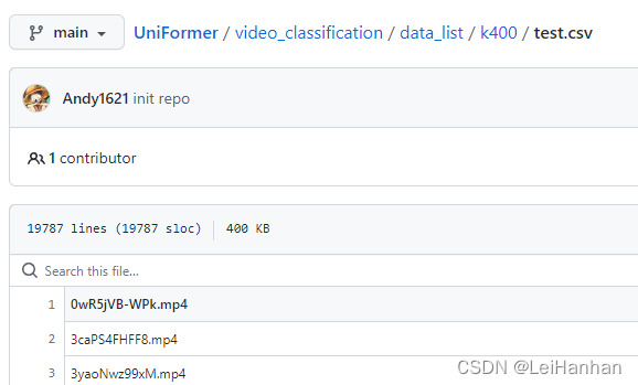 下载测试集即可:根据他提供的,k400的测试集一共有19787条。华为那边给我的数据集只有19760条,将就着用吧!【不好到youtube上面扒数据,有的视频已经扒不了了,而且我之前在网上找了个数据集只有19404条】