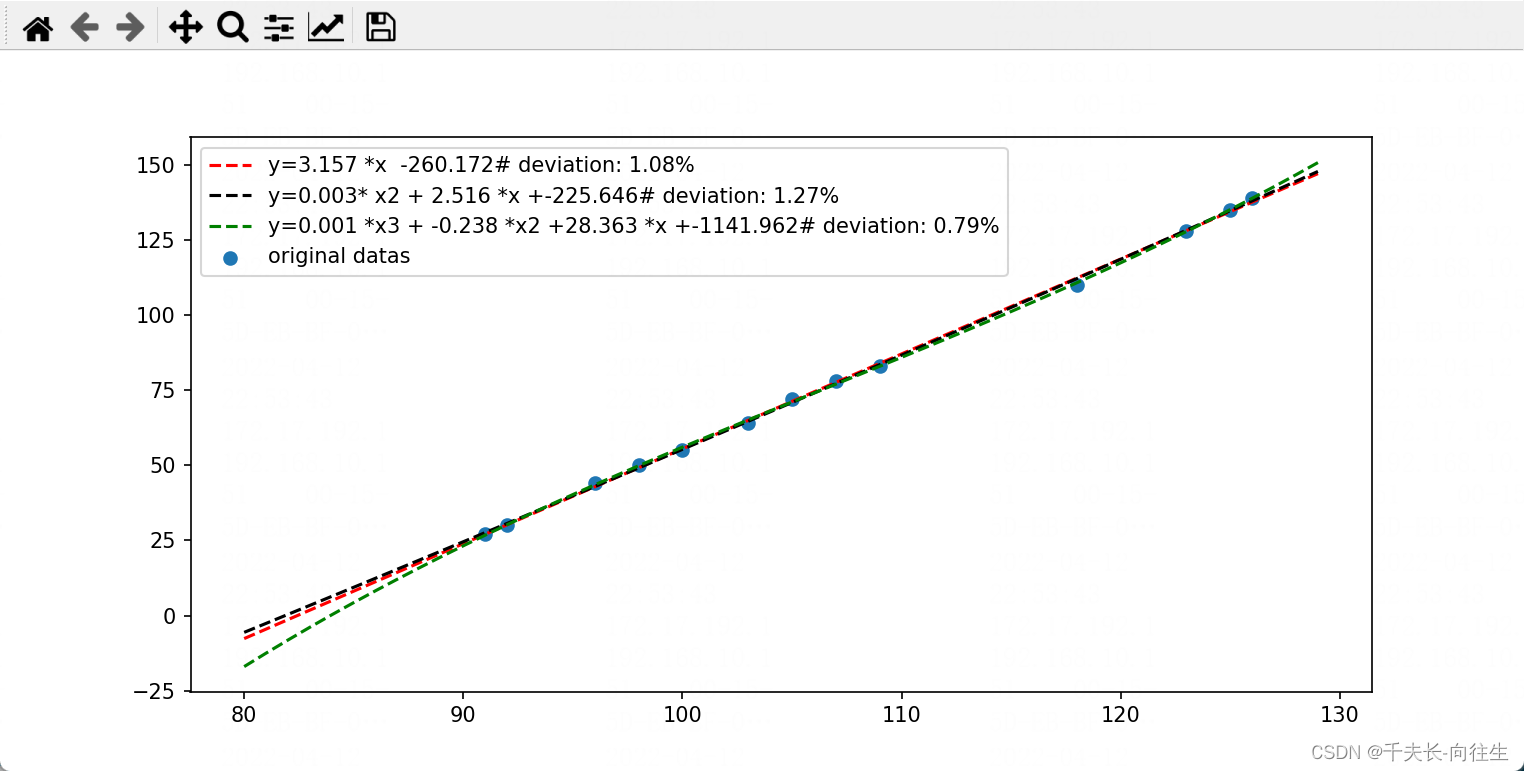 ????????使用Python代码,用1,2,3阶的拟合函数来求解(4阶匹配效果很差),核心代码为;