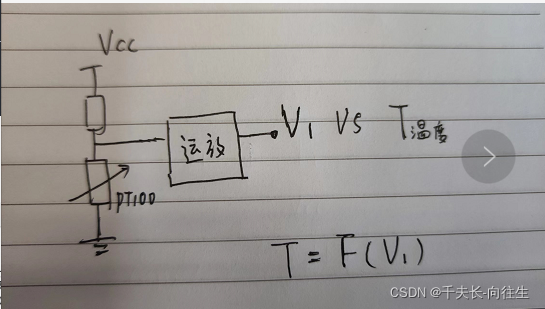 ????????PT100热电偶串入到电路中,只能测量电压V1和对应的温度值T,求T和V之间的公式,不确定是几阶的函数,运放的参数也未知。